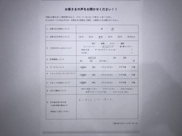 事業運営の更なる品質向上とお客様満足度向上を目指して、当社のサービスをご利用頂いたお客様よりアンケート記入をお願いしております。ご協力頂いたお客様のアンケートをHP上で見れるように記載しております。